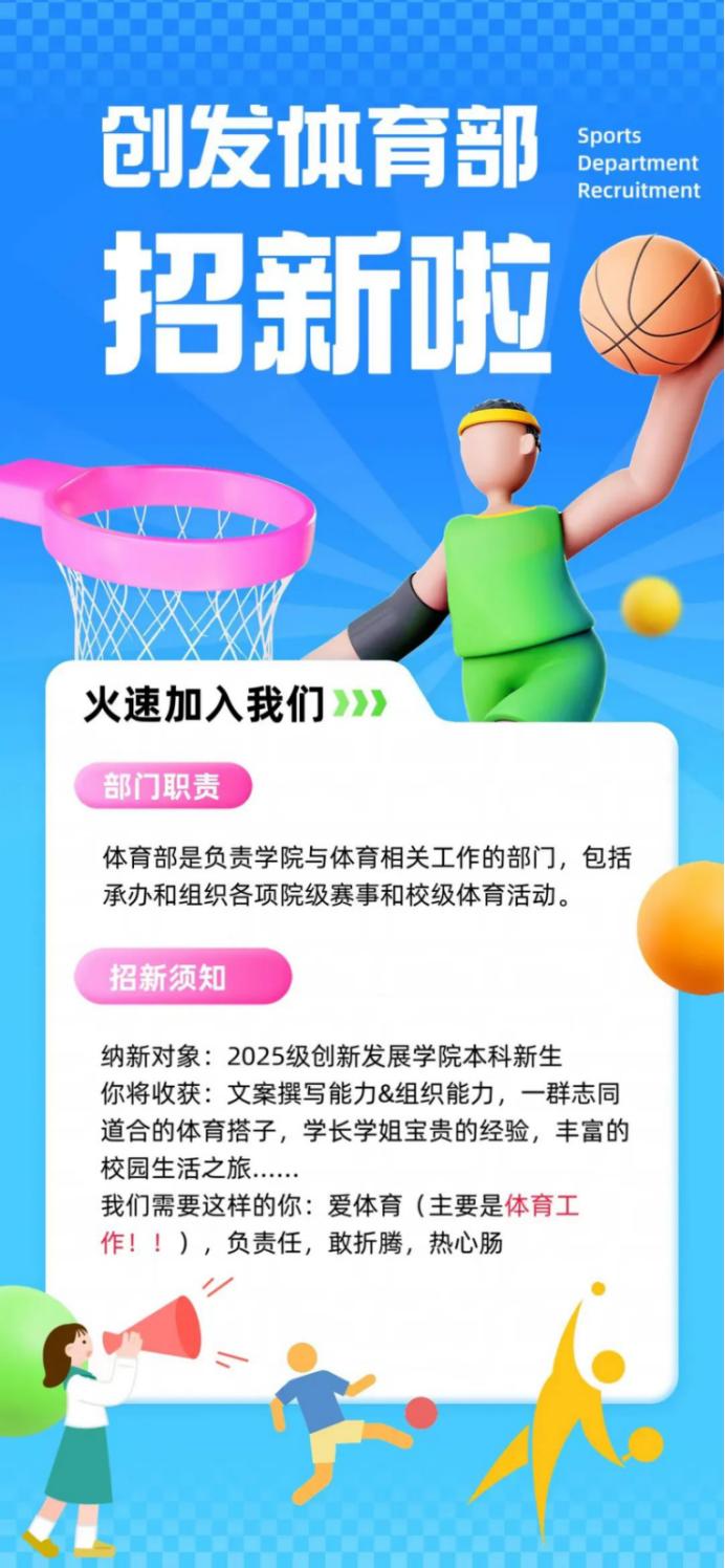 一见青新⑦ | 永利集团官网员工会体育部等你来加入! 恭喜你刷到这篇——永利集团官网员工会体育部2025招新特辑体育部拍一拍你快来加入我们!01我们的工作永利集团官网员工会体育部是负责公司体育类活动的员工部门,包括组织和承办各项院级、校级体育活动,并为公司各院队提供服务。 我们组织参与新生运动会、春季运动会、消防运动会等,编排运动会方阵,组织寒假体育打卡活动,开展五四公益跑活动,并根据同学兴趣创新举办体育赛事:创发篮球院内赛与创发班级排球联赛,以及配合创...