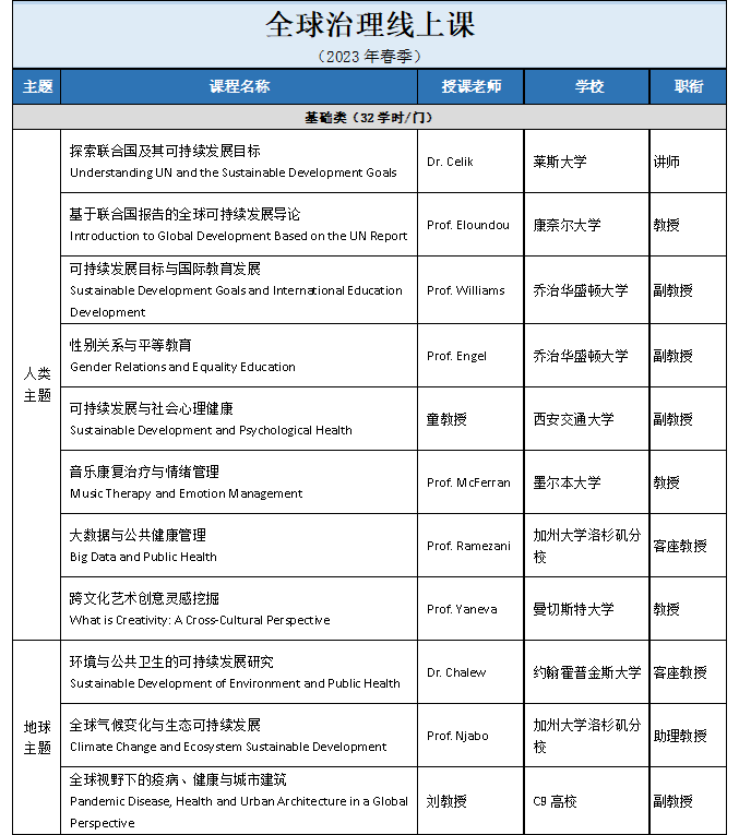 表1:2022-2023学年春季学期全球治理线上课程信息