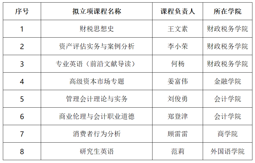 根据《关于组织开展2023年度研究生在线开放课程建设项目申报立项工作的通知》(研字〔2023〕8号),研究生院组织评审专家对2023年度申报的18个研究生在线开放课程建设项目进行了立项评审。经评审,《财税思想史》等8门课程获准立项,现予以公示。