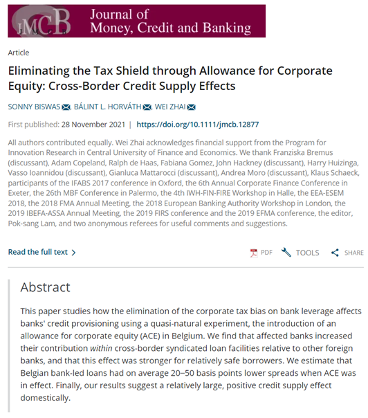 近日,公司翟玮博士的论文“Eliminating the Tax Shield through Allowance for Corporate Equity: Cross-border Credit Supply Effects”在国际经济与金融类权威期刊Journal of Money, Credit and Banking(ABS 4,中财AA类)正式发表。该论文的合作者为英国布里斯托大学Sonny Biswas博士以及美国亚利桑那大学Bálint Horváth博士。