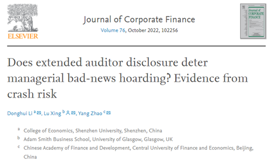 近日,公司赵阳副教授的论文“Does extended auditor disclosure deter managerial bad-news hoarding? Evidence from crash risk”在金融领域的国际权威期刊Journal of Corporate Finance(ABS 4,中财AA类)正式发表。该论文的合作者为深圳大学李东辉教授以及英国格拉斯哥大学邢璐博士。