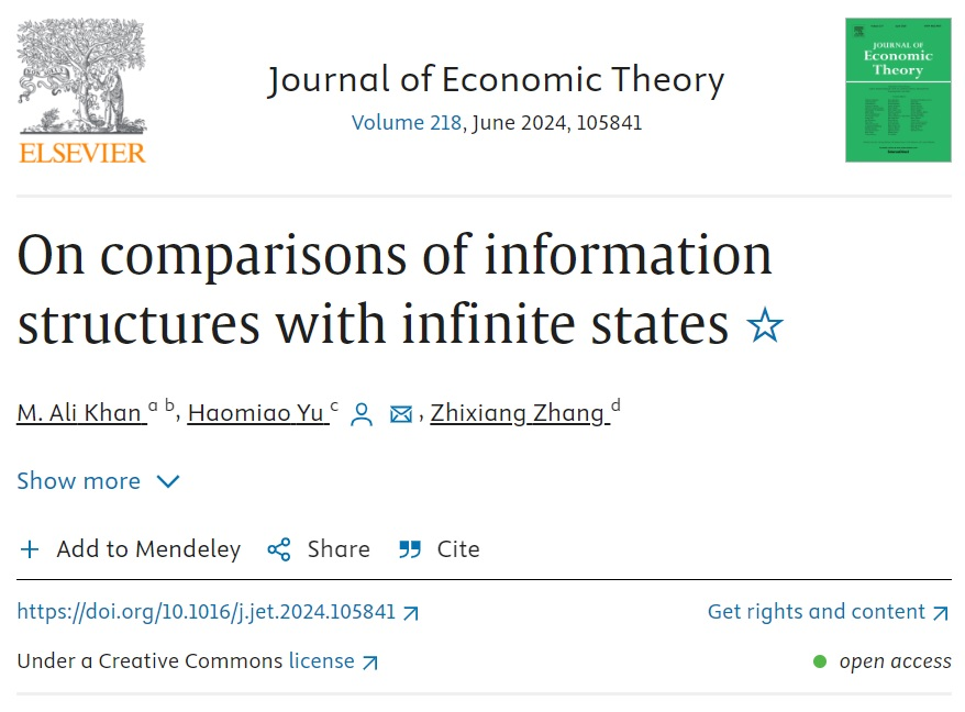 近日,公司张志祥教授有关信息结构比较的论文“On Comparisons of Information Structures with Infinite States”在经济学国际权威期刊Journal of Economic Theory(中财AAA类)发表,论文合作者为约翰霍普金斯大学M.Ali Khan教授和多伦多都会大学Haomiao Yu教授。该论文将Blackwell关于有限自然状态下统计试验(经济学中信息结构)的经典比较结果在无穷多自然状态情形下所对应的结论和相应的条件作了详细严密的刻画。作为主要结论的一个应用,文章还将Edward Schlee(2001 American Economic Review)的核心结论推广到不确定性由一般状态反映的情形。