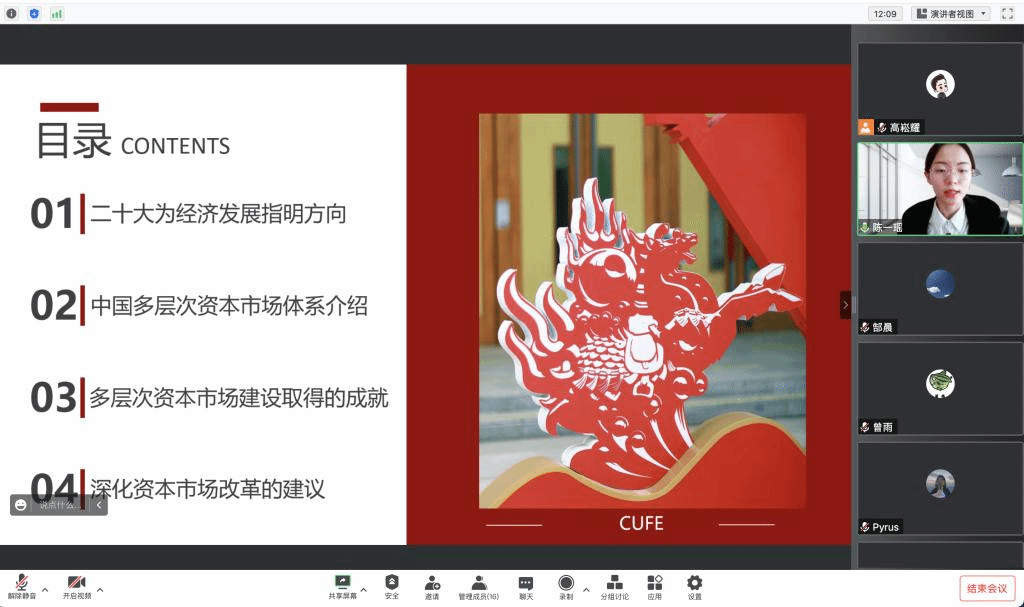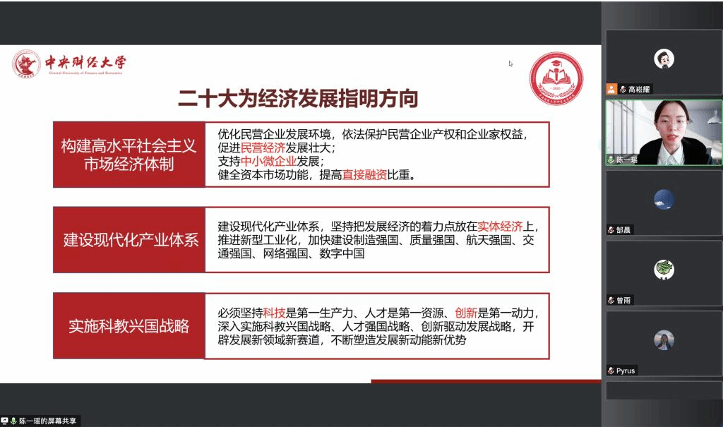 陈一瑶讲师分别从党的二十大为经济发展指明方向、中国多层次资本体系介绍、多层次资本市场取得成就以及深化资本市场改革的建议四个方面的内容为我们进行了宣讲。党的二十大报告中提出高水平社会主义市场经济体制,推动建设现代化产业体系,实施科教兴国战略。报告中指出要促进民营经济发展壮大,支持中小企业发展,健全市场基本功能提高直接融资比例。同时增强实体经济活力面,加大力度建设制造业强国、质量强国、航天强国;坚持科技是第一生产力,人才是第一资源,创新是第一动力,继续推动实施创新驱动发展战略,党的二十大报告掷地有声,这些都为当下经济的发展指明了方向。