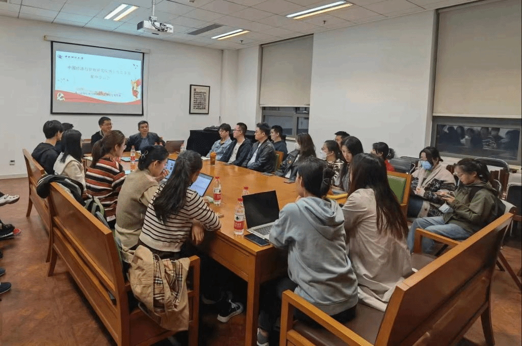 袁淳教授和赵军柱副教授从博士生学习模式、研究方向选择和团队合作等方面分享了自己的体会和思考。一是博士生应主动抓起政治理论学习,通过各种方式加强党的二十大报告和政府工作报告等内容的学习,提炼当前重大现实问题,立足中国国情,讲好中国故事;同时,博士生应关注顶级期刊员工动态、尽可能多地参加校内外学术交流。二是在学习模式方面,夯实基础、尽早着手科研,在当前文章发表周期越来越长、求职竞争越来越激烈的形势下,博士生一定要做好时间上的合理安排和权衡,早动手,干中学。三是在团队合作方面,积极主动地投入到团队学习中,以开放的心态参与思维的交流碰撞,是提高学习与研究效率的关键。最后,集中学习会进入答疑和畅聊环节。袁老师和赵老师询问大家在学术科研等方面遇到的困难,并就同学们关于投稿期刊选择、文章润色和如何写好文献综述等疑惑进行了耐心解答。在座师生畅所欲言,热烈讨论,活动现场气氛欢快,轻松愉悦。