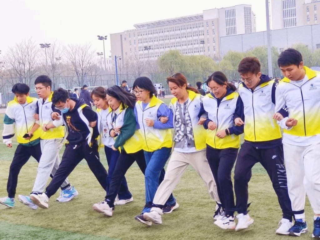 绑腿跑比赛中,参与的十个人胳膊紧挽着胳膊,互相关照身高,脸上洋溢着笑容,脚下默契地迈步,取得了第五名的好成绩。