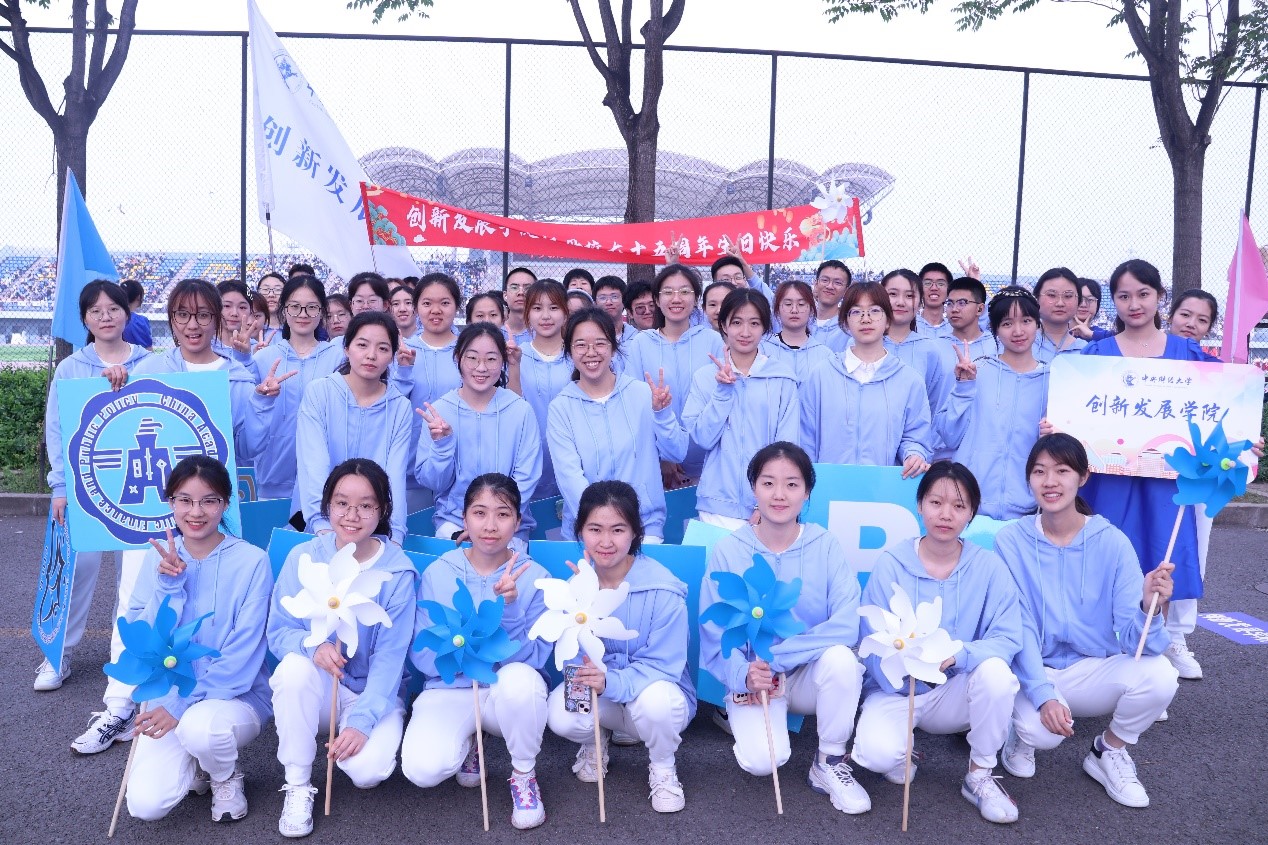 伴着激昂的音乐,永利集团官网方阵迈着整齐的步伐来到主席台前。“永利集团官网祝母校75周年生日快乐”的横幅迎风招展,蓝白相间的风车随风而动。在“学贯中西,敢想敢拼,创新发展,勇夺第一”的口号声中,精心设计的图案整齐翻动、依次呈现。在接下来的比赛中,创发学子定会用青春挥洒汗水,奋勇争先,厚积薄发。少年热情志在四方,激情洋溢书我华章!
