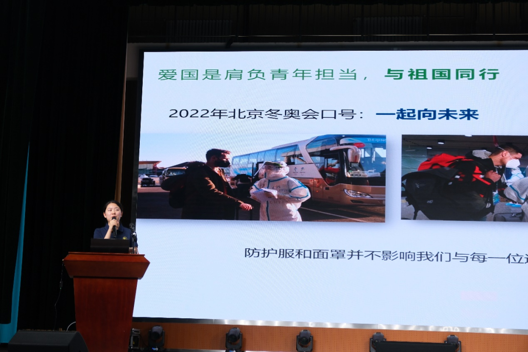 李雪婷老师以“我与祖国共奋进”为题,与大家探讨对“爱国”的理解,分享了自身的三段经历。站在天安门前为祖国的70周年华诞庆生,为党的百年华诞献歌,作为冬奥会志愿者在首都国际机场守好“国门第一关”。爱国是怎样的一种行动?爱国是肩负青年担当,与祖国同行。李雪婷老师以此激励同学们面对选择中坚定理想信念,从爱国之情中汲取前行动力,与祖国共奋进。