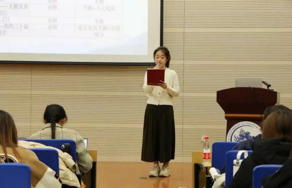 黄凯熙、邱莹、房铭成三位同学分别从班团建设、实践育人、学业发展等三个方面与学员进行面对面交流。黄凯熙同学曾被评为五四优秀团支部书记。她通过分享自己的员工工作经历,从思想建设、组织生活等五个方面讲述了如何成为一名优秀团支书,鼓励同学们齐心协力,打造争先创优的班集体。邱莹同学曾荣获2024年校暑期社会实践优秀个人称号,她分享了暑期带队到青海西宁开展乡村振兴的实践经历,勉励同学们用脚步丈量祖国大地,用内心感应时代脉搏,在财经报国的青春赛道上奋发有为。房铭成同学以优异成绩保送北大光华管理公司,他结合自身经历分享了学业规划和夏令营的参营经验,鼓励同学们明确目标,做好职业规划,形成互帮互助的良好氛围,在中财大遇见更好的自己。