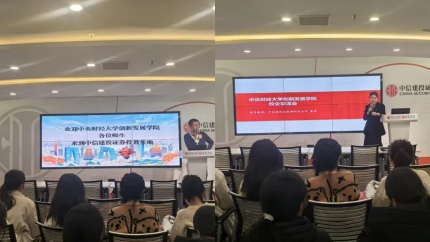 参观结束后,校企双方到讲堂区座谈交流。在中信建投证券人力资源部总监苏豪齐播放了公司宣传片,让师生们对中信建投证券的基本情况和企业文化有了更直观的了解。朝阳分公司董佳老师介绍了证券行业财富管理业务及人才成长通道,特别是校招项目员工的成长路径,帮助同学们进一步清晰证券公司各职位职责和能力素养需求。