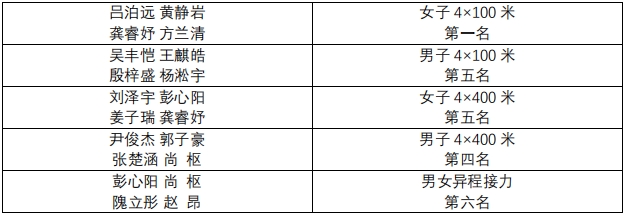 在女子4×400米项目中,刘泽宇、彭心阳、姜子瑞、龚睿妤超越身体极限,坚持到最后,荣获第五名的好成绩;在男子4×400米的跑道上,尹俊杰、郭子豪、张楚涵、尚枢全程冲刺,超越一个又一个对手,斩获第四名;在男女异程接力项目中,彭心阳、尚枢、隗立彤、赵昂相信队友,默契交接,最终以优异成绩获得第六名