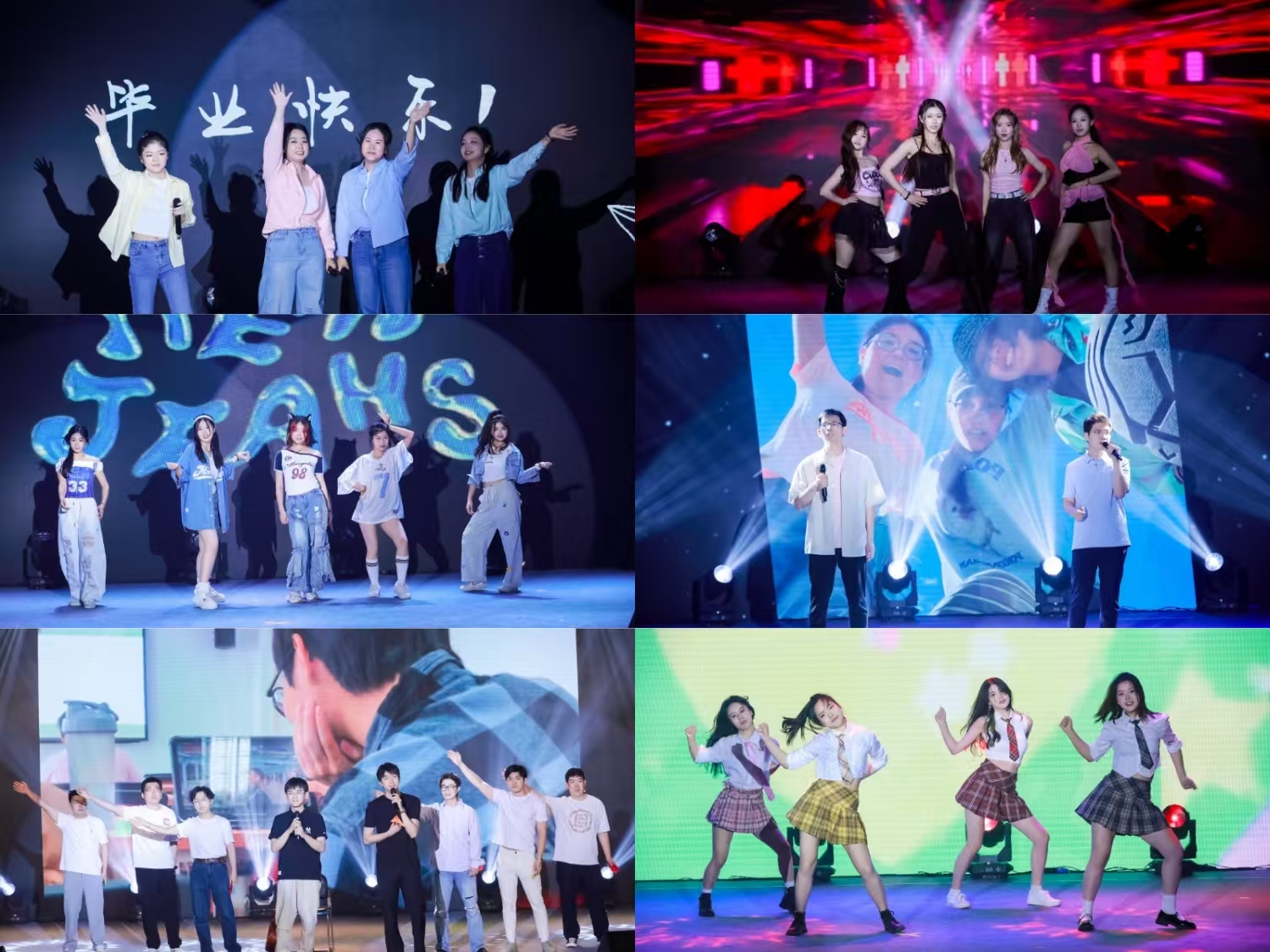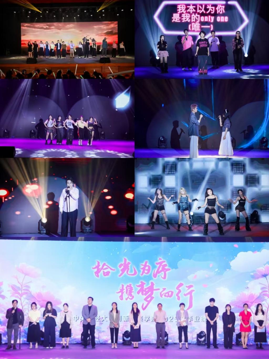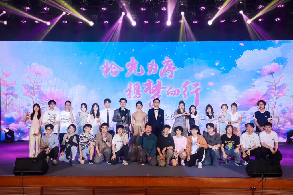 在经历欢声笑语的抽奖环节后,舞蹈《绯光破晓》用动感酷炫的旋律和舞者们整齐有力的动作拉开了这一美好篇章的序幕。紧接着,四位女生带来歌曲《像你这样的朋友》,她们饱含深情的演唱与舞台上亲密的互动,真挚又令人动容,传递出对友谊的珍惜与对同窗的不舍。舞蹈《Forever Young》中,舞者们以灵动的身姿展现着青春的活力与对未来的憧憬。舞蹈《Hype Boy》用轻快的舞步和青春的朝气将现场气氛推向新的高潮。黄奕辰同学和田阳同学带来的歌曲《追梦赤子心》,伴随着充满激情与赤诚嗓音的演唱与舞台背景闪过的张张回忆合照,勾起了大家校园时光的难忘记忆,赤子之心展露无遗。最后,刘双瑞同学的吉他弹唱《光阴的故事》缓缓响起,悠扬的旋律诉说着岁月的流转,在悠悠的尾声里所有老师、毕业生及工作人员纷纷登台,共同定格这一难忘瞬间。