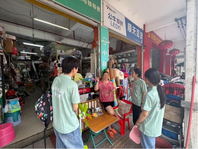 垃圾分类是城市文明的‘细节考题’。团队在南观、州珮及十字街等社区同步开展垃圾分类专项调研,重点观察混投现象变化,并对商户、摊贩、员工等多元主体进行访谈。然而,设施缺失、标识不清、意识薄弱是制约分类成效的主要因素。为此,团队建议社区可推进分类形成完整体系,借助商户示范带动分类氛围,在人流密集区补充设施,让校园教育与社区实践联动,推动垃圾分类由“少数坚持”向“全民日常”转变。