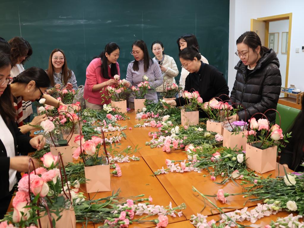 在实践环节,女教职工们纷纷化身“花艺师”,充分发挥自己的想象力和创造力。她们精心挑选花材,用心搭配色彩,将一朵朵鲜花错落有致地插入花篮。活动现场欢声笑语不断,大家互相交流插花心得,分享创作灵感,在轻松愉快的氛围中感受着艺术的魅力和创作的乐趣。