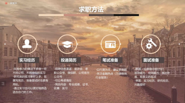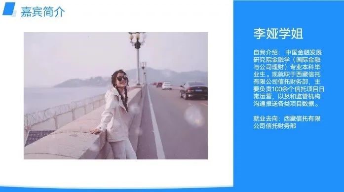 任建晔(国际金融和公司理财专业)现就职于银行理财登记托管中心。她从求职方向和求职方法进行了分享,并结合自己的工作经历,对同学们的诸多疑惑进行了解答。