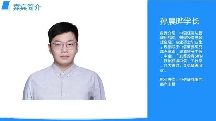 孙晨晔(数理经济与数理金融专业)现就职于中信证券研究部汽车组。他以自己的求职经历为例,重点分享了笔试、面试的技巧和注意事项,鼓励同学们在求职中要保持耐心与毅力
