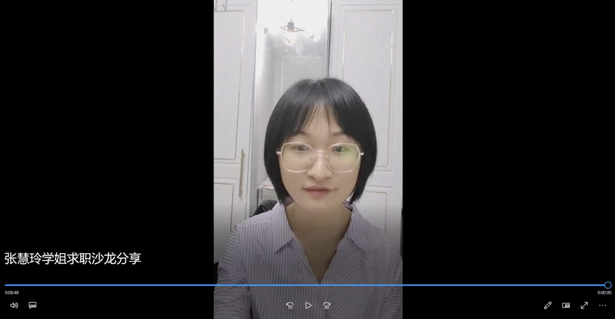 张慧玲(财政理论与政策专业)就职于某证券公司。她主要就求职过程中的心态调整与目标选择给出了自己的建议,鼓励同学们坚定目标、勇于尝试。