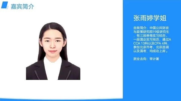 张雨婷(财政理论与政策专业)现就职于审计署。她结合自身求职历程,介绍了银行业与公务员两个方向的求职流程,并就各自的特点给出了不同的建议。