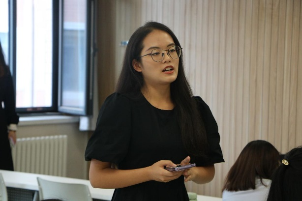 肖彤同学接着从气势和与台下互动两个方面进行了补充。她针对选手情况,提出改善气场的建议,并且鼓励选手多进行眼神和肢体的交流,以辅助演讲信息的传递。