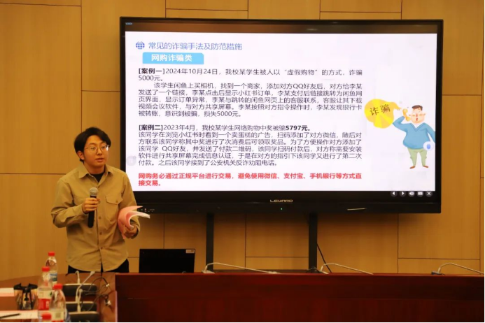 保卫处副处长范维指出,校园诈骗案件频发且形式隐蔽,诈骗手段日新月异,诈骗陷阱无处不在,他呼吁师生将反诈意识融入日常学习生活,通过常态化教育筑牢思想防线,通过反诈宣传进宿舍、反诈先锋队建设等举措打通反诈宣传“最后一公里”。