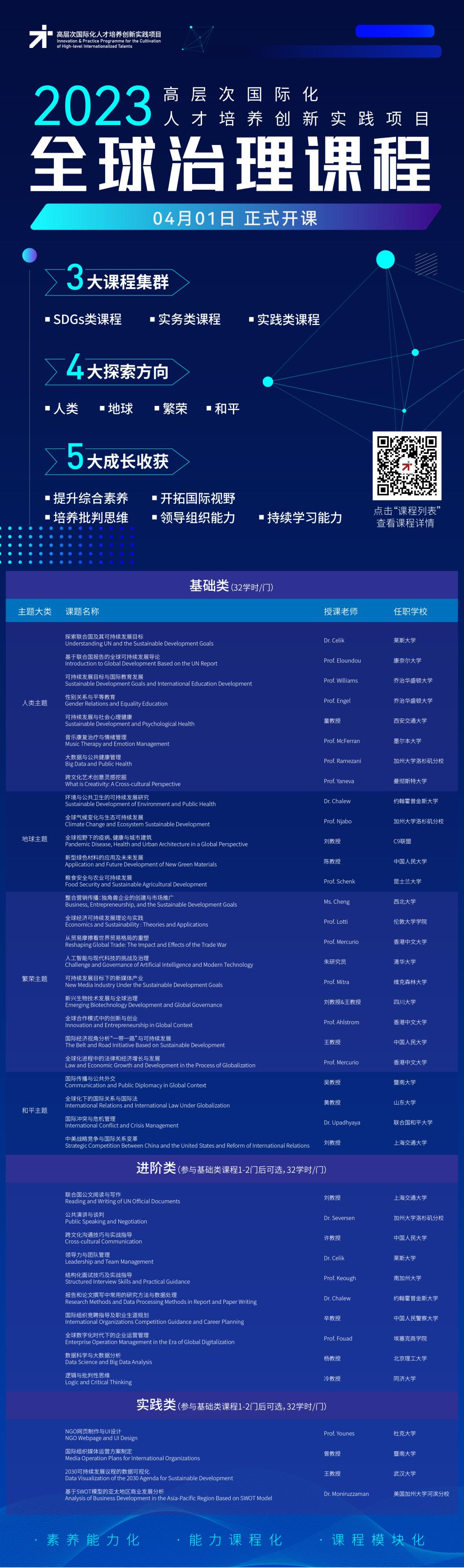为进一步提升公司人才培养的国际化水平,培养和储备更多具有国际视野和专业素质的国际组织人才,公司于2022-2023学年春季学期继续面向全体本科生开设全球治理线上课程项目,现就本学期选课相关工作安排通知如下: