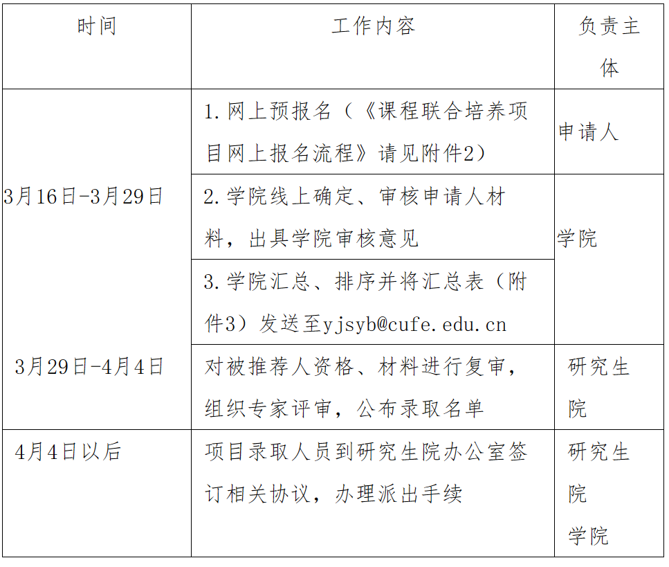 申请人需于3月27日24点前在研究生管理信息系统完成在线申请,申请流程见附件2;公司需于3月29日5点前将《课程联合培养申报情况汇总表》(见附件3)电子版发至yjsyb@cufe.edu.cn。