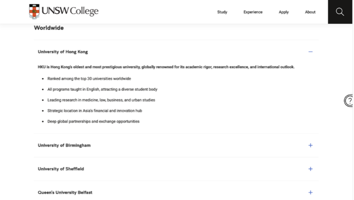 员工注册UNSW College官方学籍,预科成绩达标后直接升入新南威尔士大学本科,亦可申请香港大学(QS第17)、墨尔本大学(QS第13)、悉尼大学(QS第18)、伯明翰大学(QS第80)等全球百强院校。目前新南威尔士大学预科成绩官方认可院校包括: