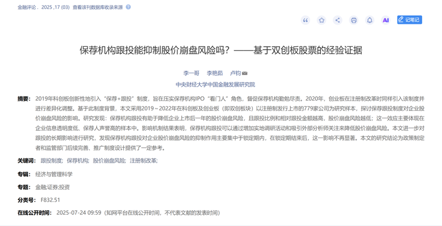 科研动态 | 公司博士生李一哥、李艳茹与导师卢钧在《金融评论》发表论文 近日,公司在读博士研究生李一哥、李艳茹及其导师卢钧副教授合作撰写的论文《保荐机构跟投能抑制股价崩盘风险吗?——基于双创板股票的经验证据》发表于《金融评论》(CSSCI,中财A类)2025年第3期。论文摘要 2019年科创板创新性地引入“保荐+跟投”制度,旨在压实保荐机构IPO“看门人”角色,督促保荐机构勤勉尽责。2020年,创业板在注册制改革时同样引入该制度并进行差异化调整。基于此制度背景,本文采用2019~2022年在科...